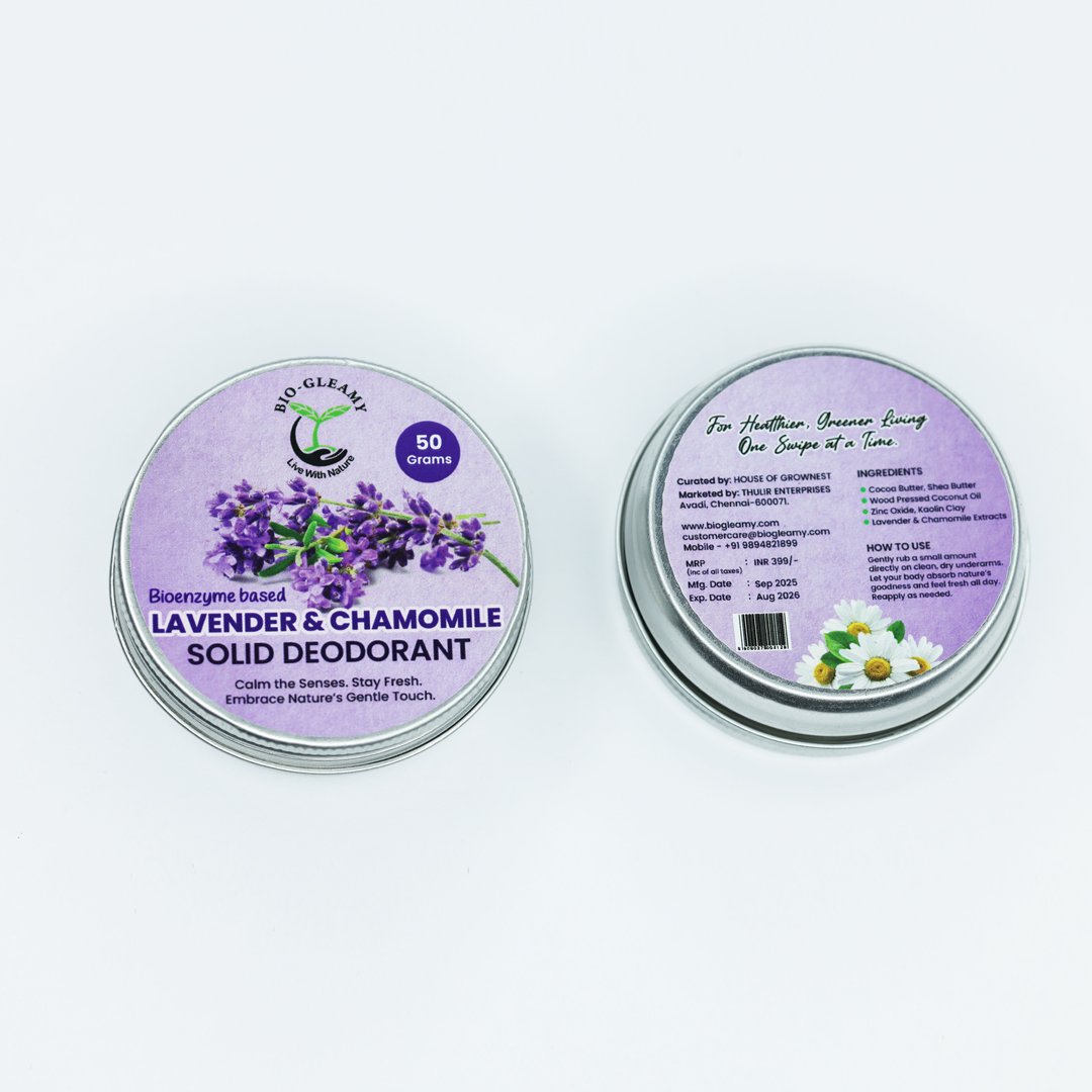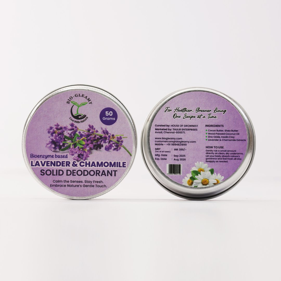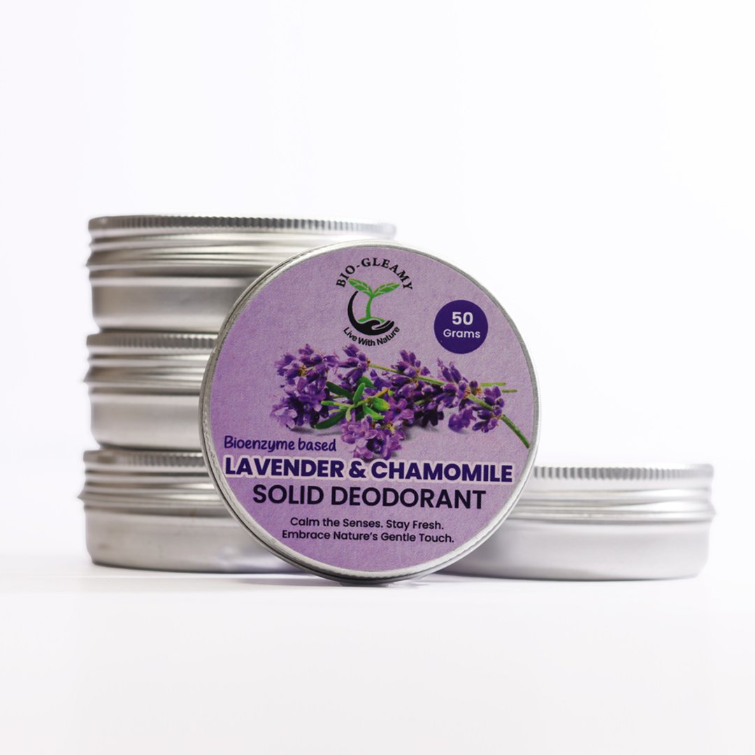 An enzyme-based Lavender & Chamomile Solid Deodorant is a natural, eco-friendly deodorant that uses enzymes to help control odor-causing bacteria, combined with lavender and chamomile essential oils for their soothing scent and skin-calming properties.