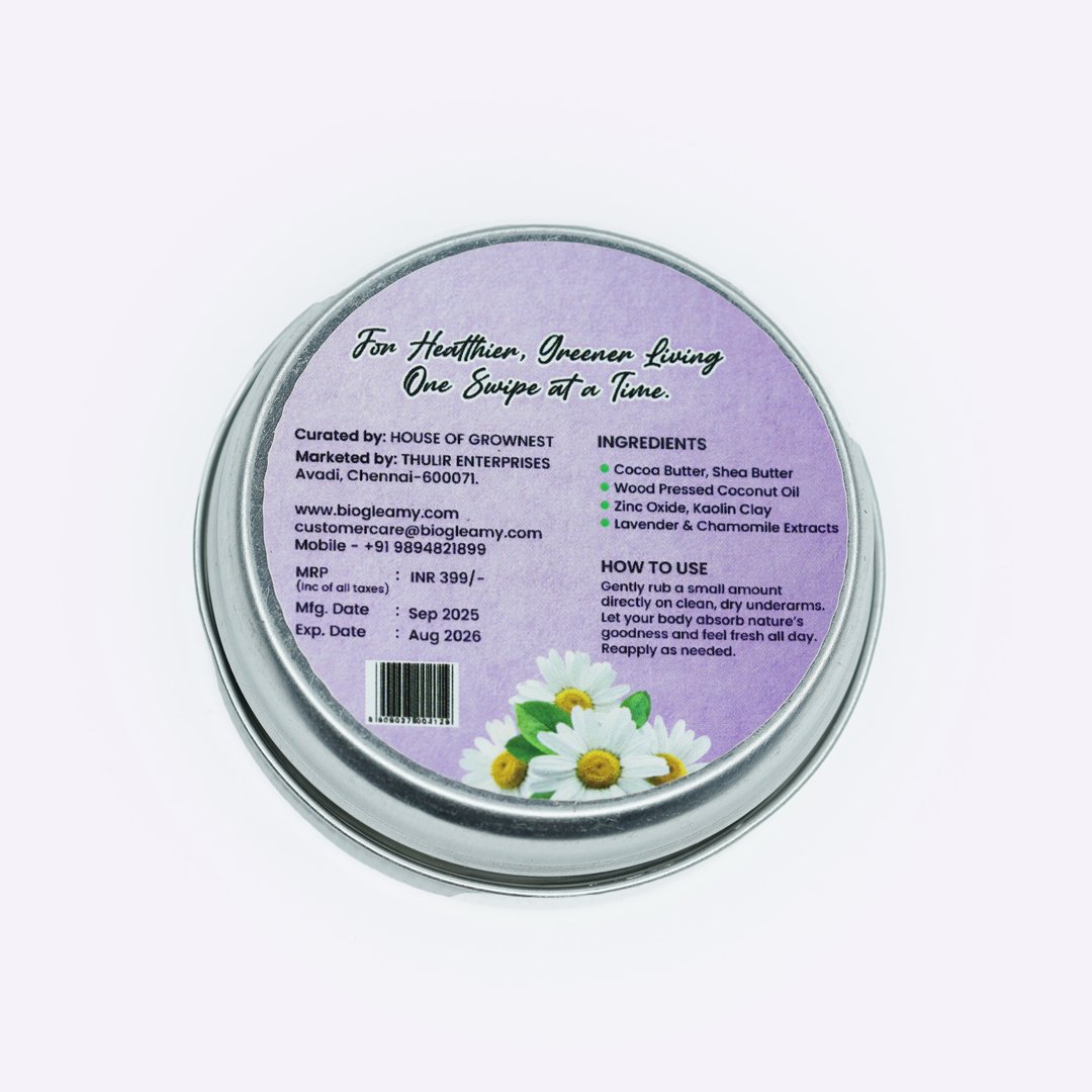 Lavender & Chamomile Solid Deodorant is a natural, aluminum-free deodorant designed to neutralize body odor using gentle, skin-friendly ingredients. Infused with lavender and chamomile essential oils, it offers a soothing, calming scent while helping to reduce irritation. Made with enzymes to target odor-causing bacteria, this solid balm glides on smoothly and keeps you fresh without clogging pores. Ideal for sensitive skin and eco-conscious users.
