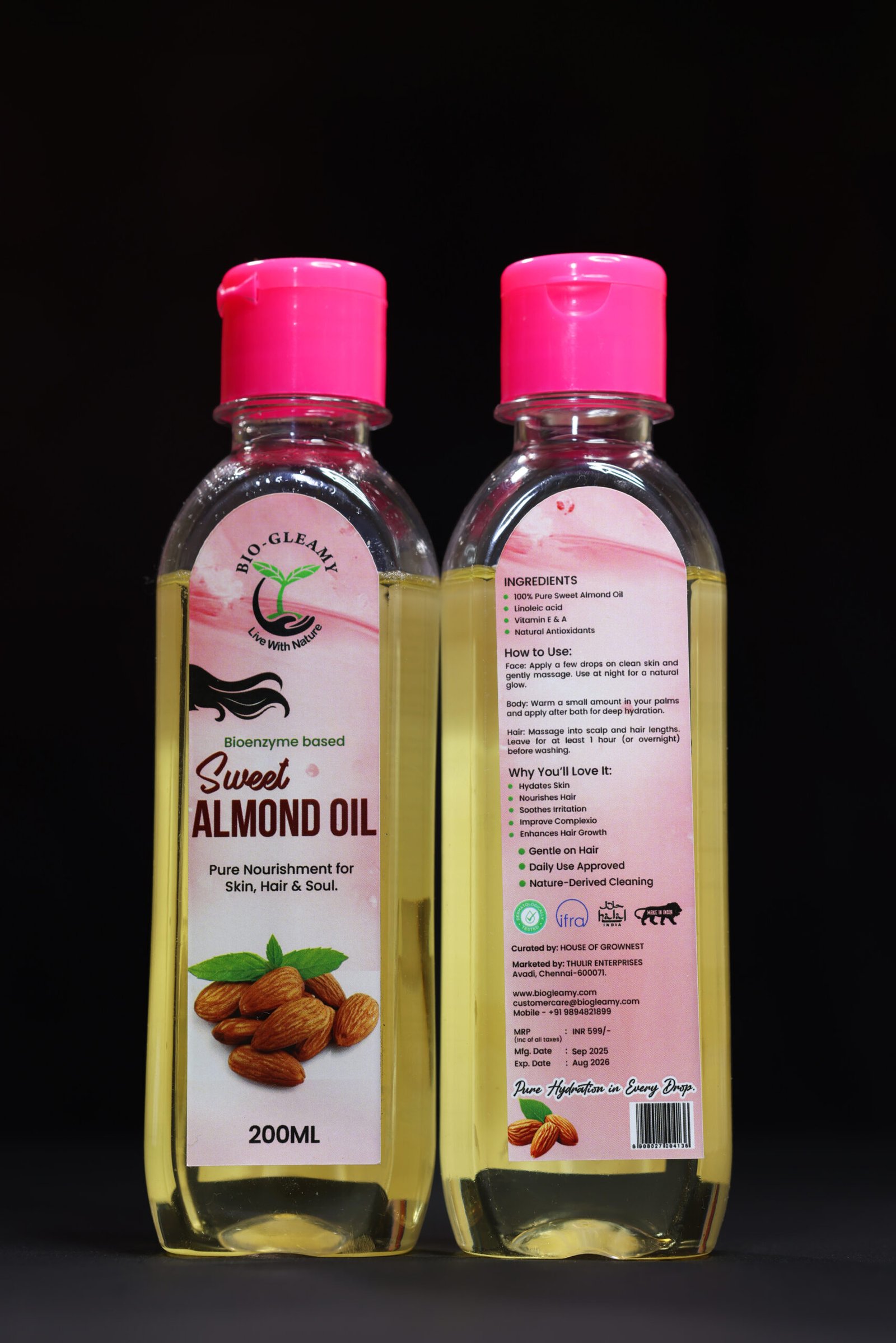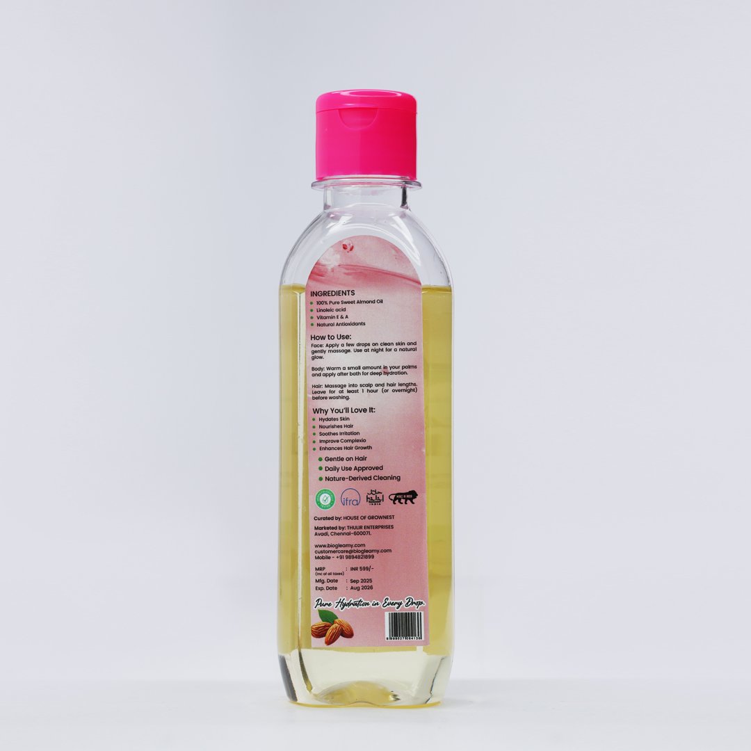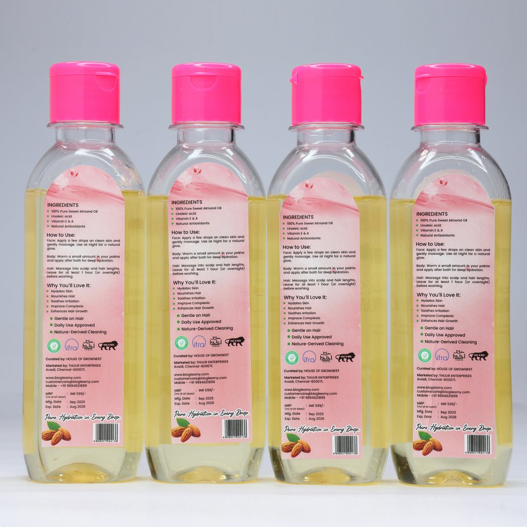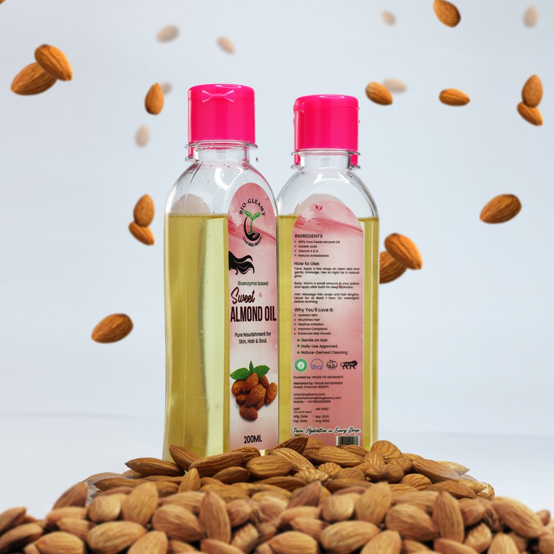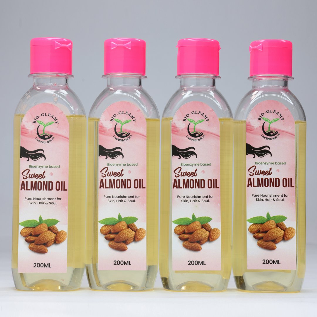 Enzyme-based Sweet Almond Oil typically refers to sweet almond oil that has been extracted or processed using enzymatic methods rather than traditional mechanical pressing or chemical solvents.Extracted from the finest almonds, this gentle,vitamin-rich oil is your all-in-one natural moisturizer. Whether you’re looking to soften skin, nourish hair, or massage your body — this bottle does it all, without additives or preservatives.
